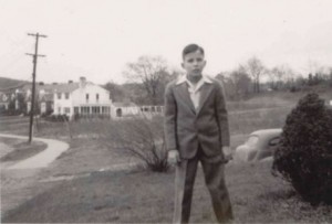Photo of Ann Haas’s brother, taken around 1948, looking down Q Street toward MacArthur Blvd, with the Indian Rock area behind.